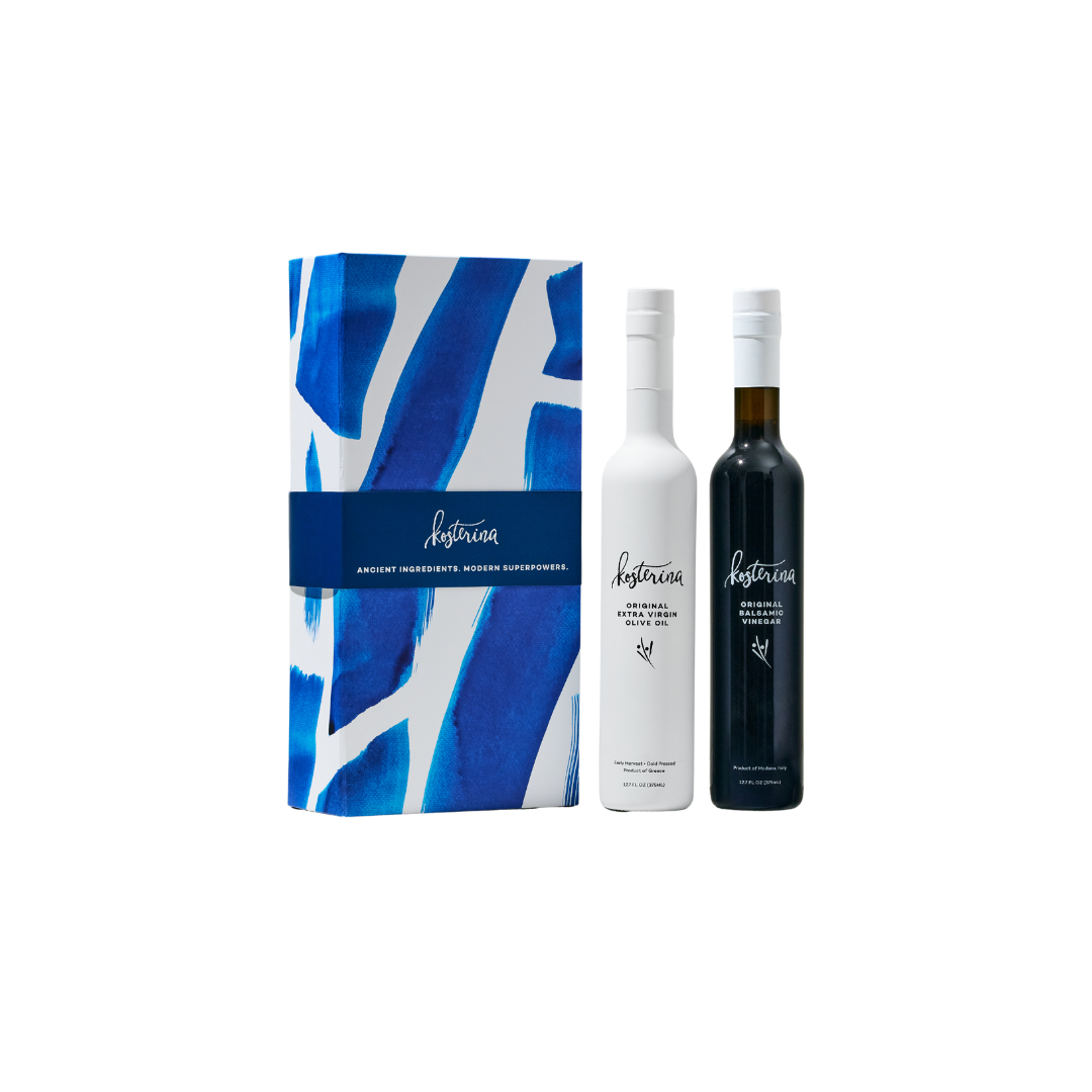 The most classic pairing, this Duo includes our ultra-premium EVOO and our Original Balsamic Vinegar perfect for all your dipping and drizzling needs. No wrapping required, this gift set comes in a box designed by a local artist, reflecting the aesthetic of modern-day Greece. This gift is perfect for the Holiday Season, celebrating with a gift that everyone can enjoy.